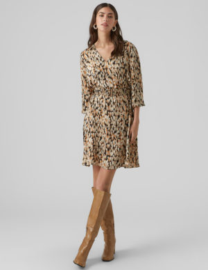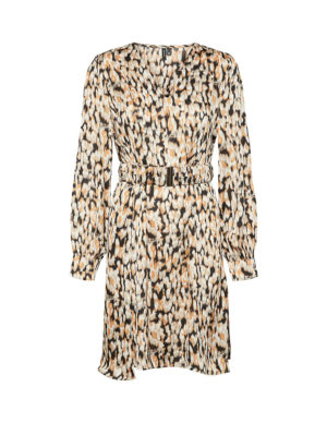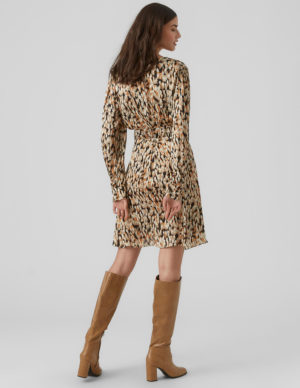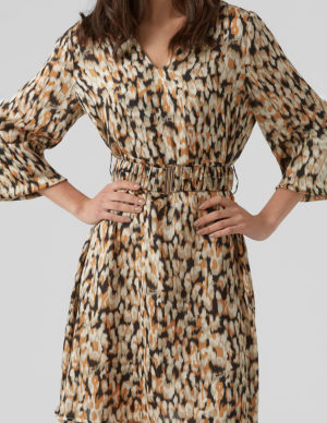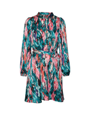 MСукня із атласного матеріалу, має розмитий абстрактний принт, золотистий пояс на талії та довгі рукави. V-подібний виріз горловини, манжети на ґудзиках