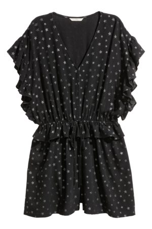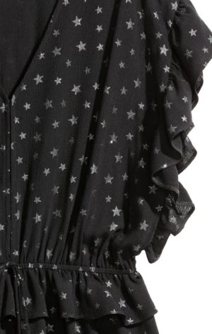 LКомбинезон из вискозной ткани с блестящим рисунком. На комбинезоне спереди треугольный вырез и застежка на потайные крючки. Короткий рукав с оборкой, переходящей на бока. Отрезной по резинке, кулиске и оборке на талии. Короткие брючины. Без подкладки.