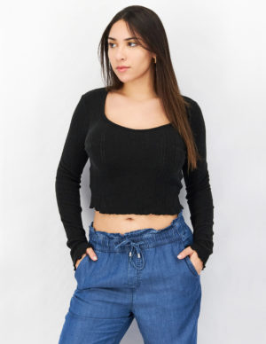 M LУкорочений лонгслів з фігурним вирізом горловини із м’якого трикотажу з довгими рукавами