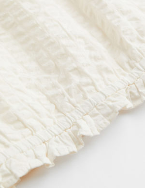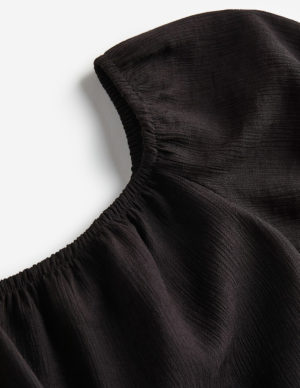 134 см 146 см 152 см 158 см 164 см 170 смУкорочена блуза із плетеної тканини з широким вирізом, спущеними плечима та короткими рукавами-буфами. Еластичний край на рукавах і низу