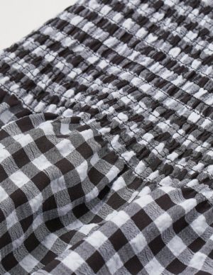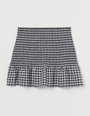 S M XLКоротка тканинна спідниця зі зборкою на гумці зверху в клітинку. Еластична талія, знизу широка оборка