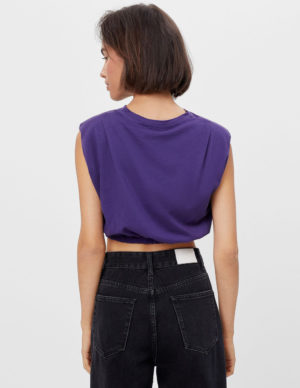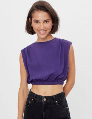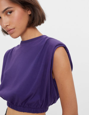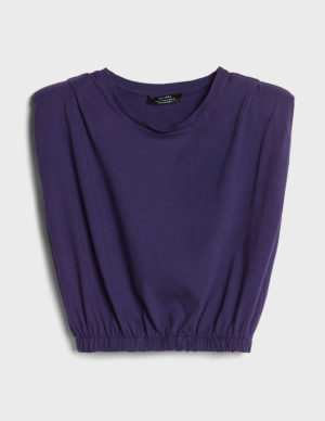 XSУкорочена футболка з підплечниками та защипами на плечах із м`якої бавовняної тканини. Круглий виріз горловини, еластична гумка знизу