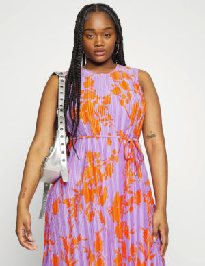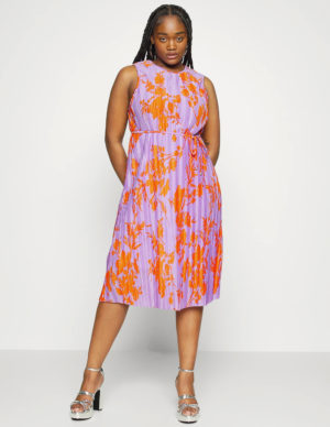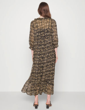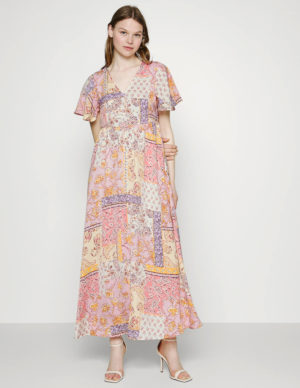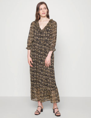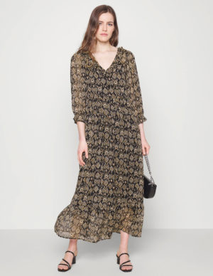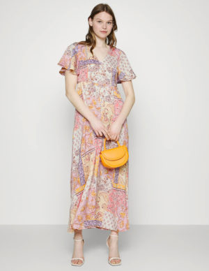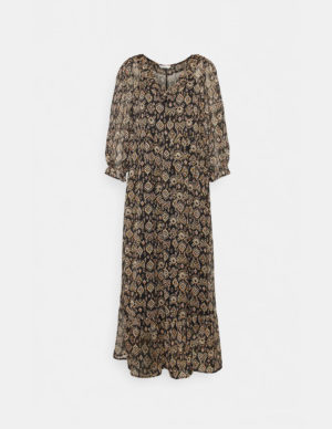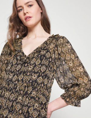 SСукня в принт з шифонової тканини, під нижньою частиною є вшита підкладка. V-подібний виріз горловини, рукави довжиною 3/4 з оборкою на манжетах