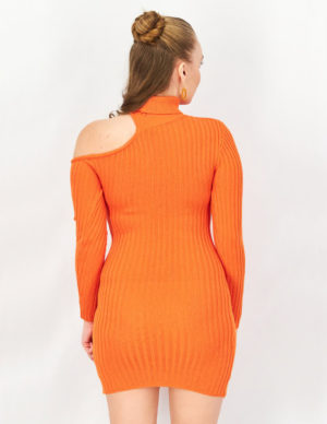 XS S MАсиметрична сукня з високим коміром, відкритим плечем та довгими рукавами із м’якої віскозної тканини в рубчик