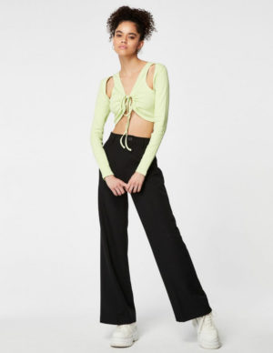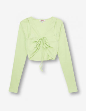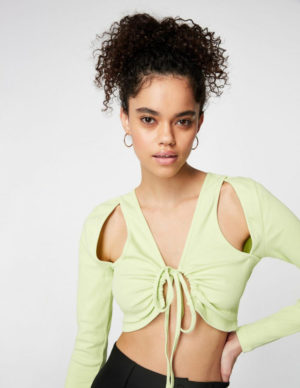 XXS XS S MУкорочений лонгслів в рубчик з вирізами по боках на зав’язках спереду із бавовняного трикотажу з довгими рукавами, V-подібний виріз горловини