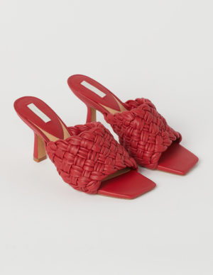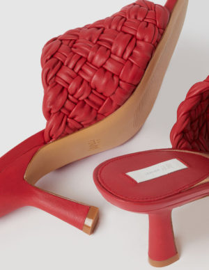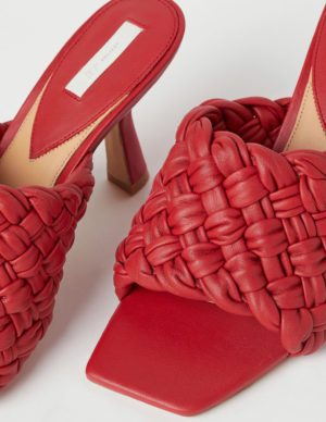 35 42Шльопанці із м’якої шкіри на відкритому квадратному підборі. Широка плетена стрічка на стопі, підкладка та устілка зі шкіри. Підбори 8 см