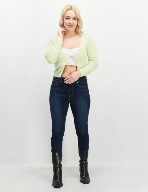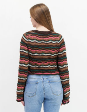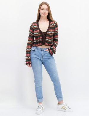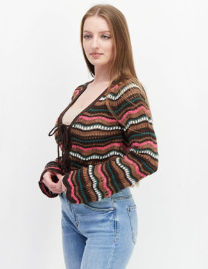 LРізнокольорова укорочена в’язана кофта з довгими рукавами, V-подібним вирізом та зав’язкою спереду