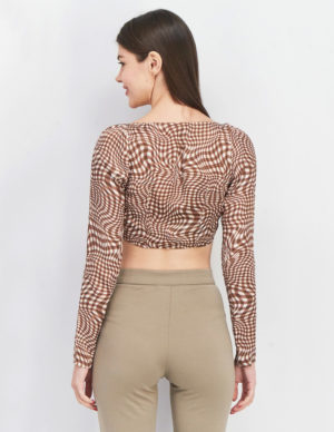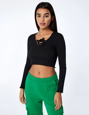 LУкорочений лонгслів із бавовняного трикотажу з довгим рукавом і зав’язкою спереду. V-подібний виріз горловини