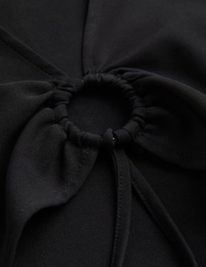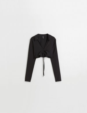 SУкорочена блуза. Комір, V-подібний виріз, довгі рукави. Спереду декорована металевим кільцем з довгою зав’язкою