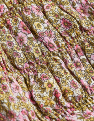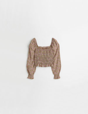 XLБлуза з м`якої віскозної тканини з малюнком. Прямокутний виріз горловини, оброблений короткою оборкою. Верх зі складками для ефекту драпірування, еластичні шви по подолу. Гумка на плечах та довгі рукави з еластичним краєм та оборками