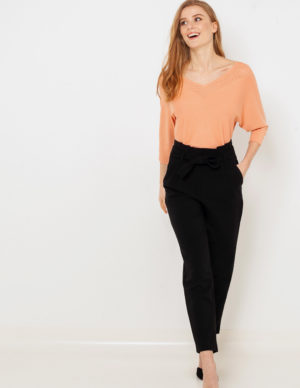 LРозкльошені брюки з м’якої еластичної тканини без кишень. Спереду вертикальні шви вздовж брюк, висока талія