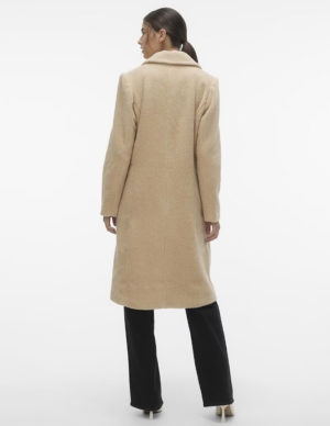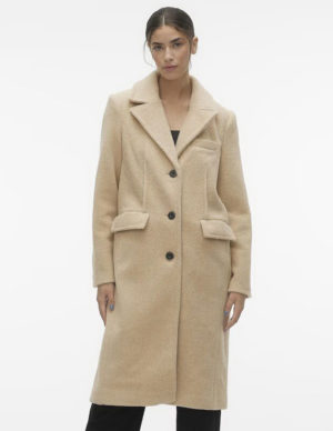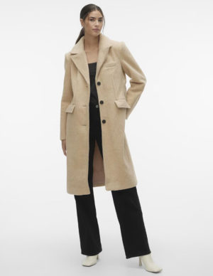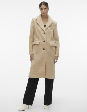 MПодовжене пальто прямого крою з прямокутними лацканами та довгими рукавами. Застібається на ґудзики спереду, дві прорізні кишені
