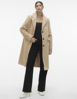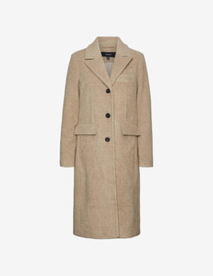 MПальто прямого крою з прямокутними лацканами та довгими рукавами. Застібається на ґудзики спереду, дві прорізні кишені