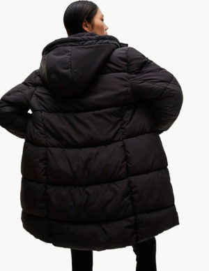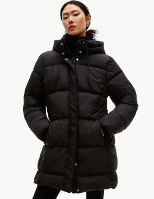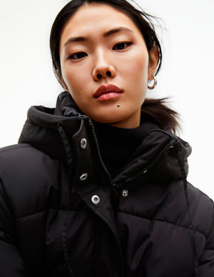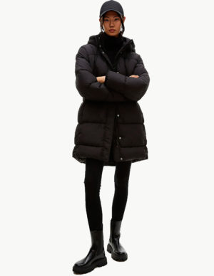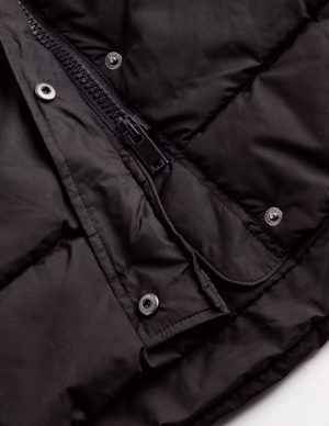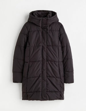 LУтеплене стьобане пальто довжиною до коліна. Комір стійка, капюшон зі шнурком на підкладці. Застібається на двосторонню блискавку та клапан із прихованими кнопками. Прорізні кишені в бічних швах. Потайний манжет в рубчик внизу рукавів. З підкладкою
