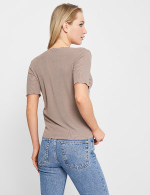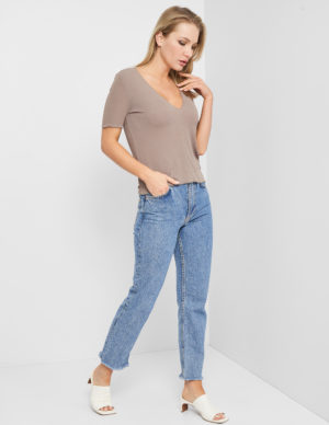M LТкана блузка, що облягає фігуру, з глибоким V-подібним вирізом. Застібка на ґудзики спереду, рукава 3/4 з еластичними манжетами