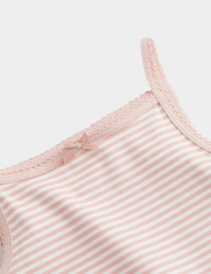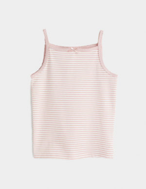 134/140Майка із бавовняного трикотажу в смужку. Тоненьки бретелі, хвилястий край зверху та декоративний бант спереду