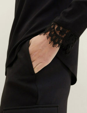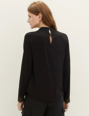 SБлуза вільного крою з коміром стійкою із віскози. Довгі рукава з мереживом, ззаду V-подібний виріз на ґудзиках