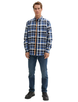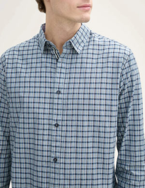SСорочка в клітинку із бавовняної тканини. Комір з куточками, перед класичний із застібкою на ґудзики. Довгі рукава з манжетами на ґудзиках