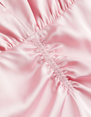 MСукня без рукавів до коліна з м’яко драпірованого атласу. Круглий виріз горловини та отвір із прихованою застібкою на ґудзику спереду. Ліф зі зібраними швами на плечах та спинці. Вузька гумка на талії та еластична деталь спереду спідниці для драпірованого ефекту. Прихована блискавка з одного боку. На підкладці