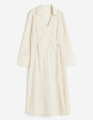 XS SСукня до литок з тканої м’ятої бавовняної тканини. Комір, запах спереду з прихованою застібкою на ґудзики з одного боку та вузькі зав’язки з іншого. Довгі рукави та широкі манжети на ґудзиках. Без підкладки