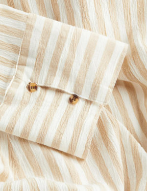 SКоротка сукня з саржі, виготовлена з суміші льону та бавовни, з коміром та ґудзиками спереду. Ліф вільного крою, звужена талія зі швом та складками, а також облягаюча спідниця. Довгі, широкі рукави з розрізом та ґудзиками на манжетах. Без підкладки