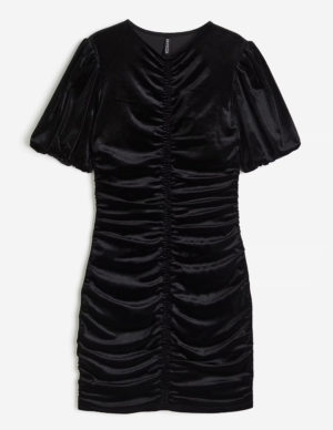 S M LКоротка приталена сукня з круглим вирізом горловини, короткими пишними рукавами з вузькою гумкою на манжетах та еластичним зібраним швом спереду для створення м’якого драпірування