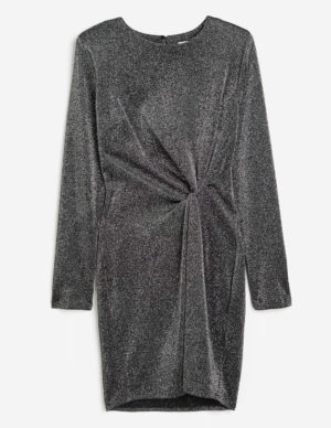 XS XXLКоротка, приталена сукня з м’якого трикотажу з круглим вирізом горловини та застібкою-щільцею з прихованою ґудзиком ззаду на горловині. Тонкі підплічники, довгі рукави та вузол з одного боку талії для м’якого драпірування