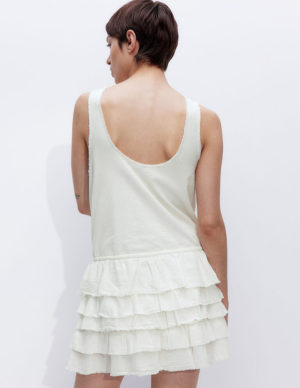 XS S M L XL XXLКоротка сукня з тканої тканини з відкритими плечима, облягаючим ліфом і короткими рукавами, обидві з облямівкою та невеликою оборкою по верхньому краю. Збірки на талії та розкльошена спідниця. Без підкладки