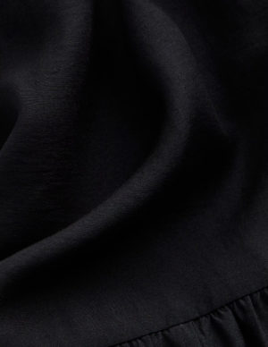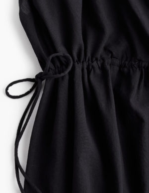 S L XXLСукня без рукавів, довжиною до щиколотки, з повітряної бавовняної тканини, об’ємного силуету. Глибокий V-подібний виріз спереду та ззаду, надзвичайно вузькі зав’язки ззаду на горловині та складки на плечах. Вузькі шнурки для зав’язування з боків на талії. Без підкладки