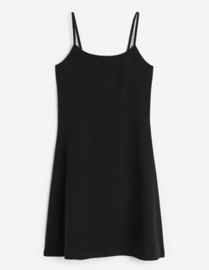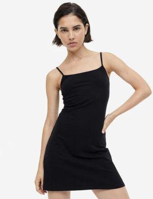 XSКоротка сукня з м’якого бавовняного трикотажу з глибоким круглим вирізом, вузькими бретелями, приталеним ліфом та злегка розкльошеною спідницею