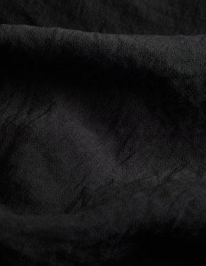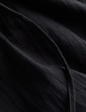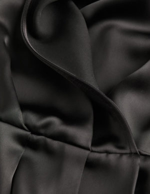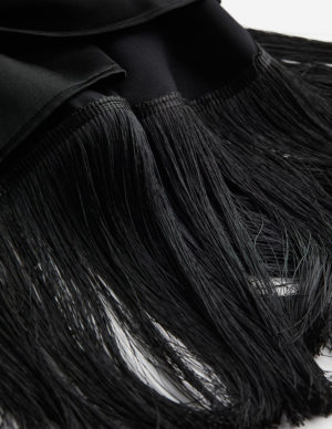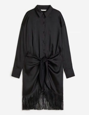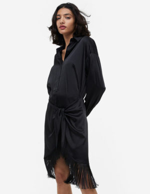 SКоротка сукня з м’яко драпірованого атласу з коміром і ґудзиками спереду. Спущені плечі та довгі рукави з розрізом і манжетами на ґудзиках. Спідниця-халат з широкими зав’язками спереду та довгою бахромою по низу. Без підкладки