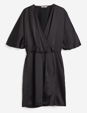 XS MКоротка сукня з м’яко драпірованого атласу з вшитим запахом спереду. Вільний крій з глибоким V-подібним вирізом і короткими широкими рукавами. Еластичний шов на талії та прихована блискавка з одного боку. Без підкладки