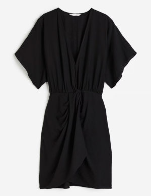 XSКоротка сукня з тканої тканини з глибоким V-подібним вирізом і прихованою застібкою на гачки спереду. Широкі рукави до ліктя, еластичний шов на талії та вшита спідниця-халат. Без підкладки