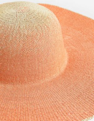 S MДвоколірний капелюх з паперової соломки із заокругленою головкою, широкими полями та грогреневою стрічкою всередині. Ширина полів 13 см