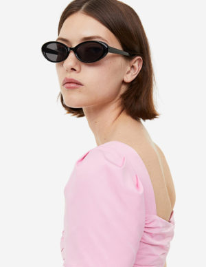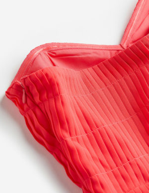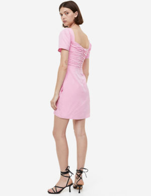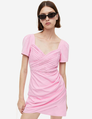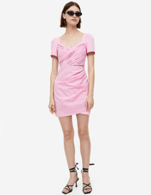 SПриталена коротка сукня з тканої тканини зі складеним ліфом, вирізом у формі серця та короткими пишними рукавами з прихованою силіконовою обробкою на плечах. Спідниця має перехресні клапани та складки, пришиті з одного боку для створення ефекту легкого драпірування. Прихована блискавка ззаду. На підкладці