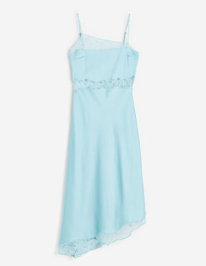 MСукня до литок з м’яко драпірованого атласу з асиметричними мереживними вставками та регульованими бретельками-спагеті. Прихована блискавка та застібка на гачок з одного боку. Без підкладки
