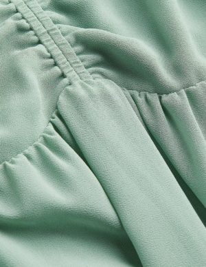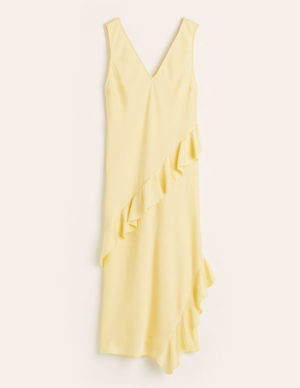 XLСукня до литок з тканої тканини з легким блиском. Квадратний виріз горловини та вузькі регульовані бретелі. Відкритий ззаду з двома горизонтальними еластичними бретелями. Зібраний шов під грудьми з прихованою гумкою ззаду та розкльошена, об’ємна спідниця. На підкладці зверху