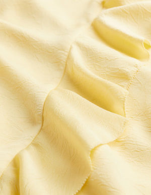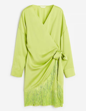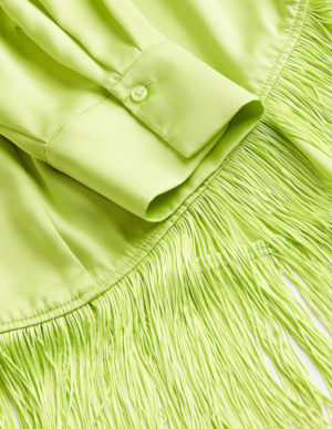 MКоротка сукня з м’яко драпірованого атласу з V-подібним вирізом горловини та запахом спереду з широкими зав’язками з одного боку. Глибоко спущені плечі та довгі рукави з розрізом і ґудзиком на манжетах. Еластичний шов ззаду на талії. Довга бахрома по низу. Без підкладки