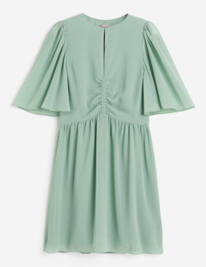 S XLКоротка сукня з прозорого крепового плетіння з круглим вирізом горловини та розрізом спереду з прихованою застібкою на ґудзик зверху. Широкі рукави-метелики та еластичний зібраний шов спереду, що створює ефект рюш. Вузька гумка на талії та злегка розкльошена спідниця. Атласна підкладка