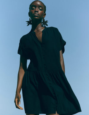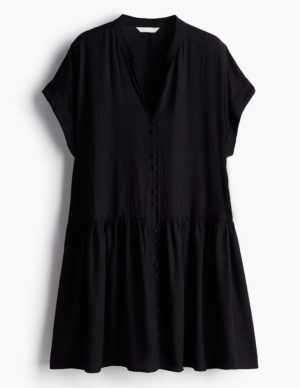 XS S L XLКоротка сукня-туніка вільного крою з м’ятого плетіння з коміром-тасьмою та V-подібним вирізом спереду. Короткі рукави з відворотами на манжетах, застібки на ґудзики спереду та зібраний шов на стегнах для додаткового об’єму. Без підкладки