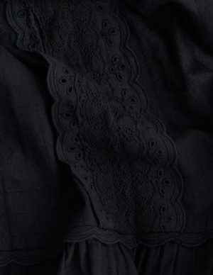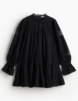 XS LКоротка сукня оверсайз з бавовняної тканини з декоративною мереживною обробкою. Невеликий комір-стійка та застібка на ґудзик ззаду на горловині. Довгі рукави з вузькою гумкою та воланом на манжетах. Зверху подол має зібрані яруси для додаткового об’єму. Без підкладки