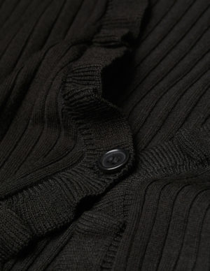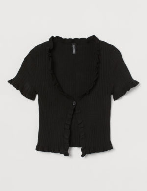 XSУкорочена кофта з ніжного трикотажу в рубчик з короткими рукавами. V-подібний виріз горловини, застібається на один ґудзик, гофровані краї