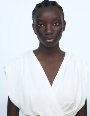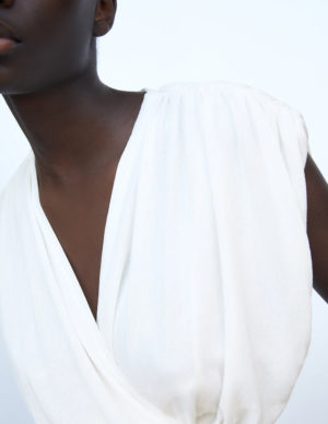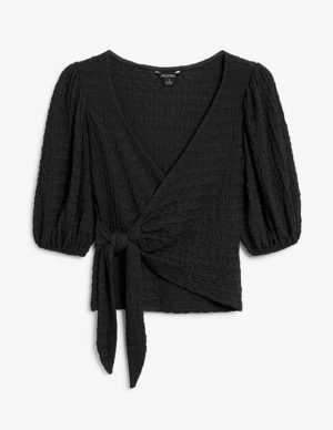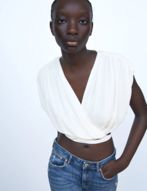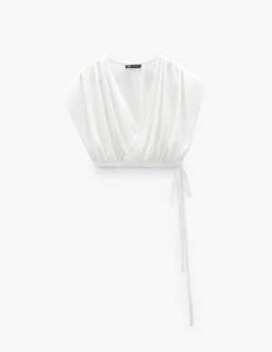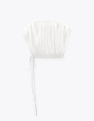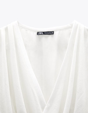 XXS XSБлуза на затин з глибоким V-подібним вирізом горловини із фактурної тканини. Короткі рукава-буфи