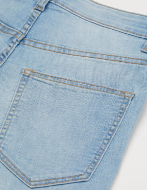 SДжинси з п’ятьма кишенями з еластичного праного деніму. Висока талія і дуже вузькі штанини. Застібка на блискавку та ґудзик. Shaping — денім із функцією стретч, підтримує і формує талію й сідниці, а також зберігає форму джинсів