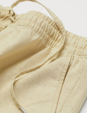 MШтани до литок з повітряного льону. Висока талія з закритою гумкою та невеликою рюшею зверху, кишені в бічних швах та широкі, прямі штанини