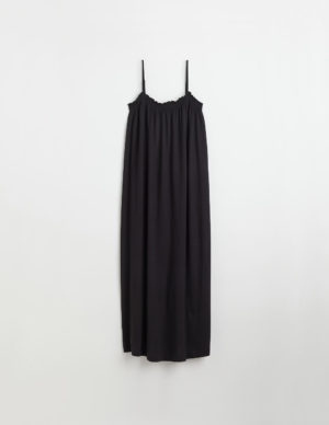 SДовга сукня з модалу та бавовняного трикотажу. Вільного крою з глибоким вирізом ззаду, вузькими регульованими бретелями, а також шлейфом-смокінгом і невеликою оборкою навколо горловини