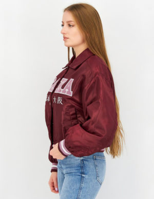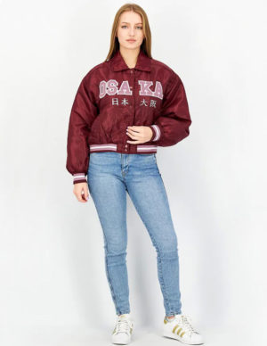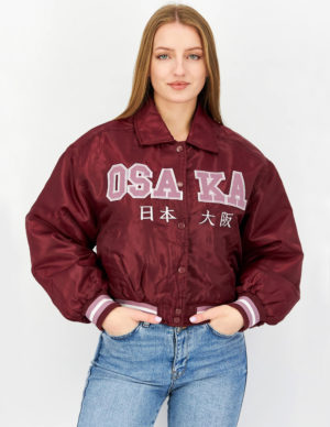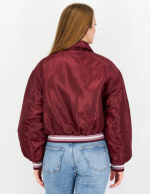 SУкорочений бомбер з коміром, спереду застібається на кнопки та має дві прорізні кишені
