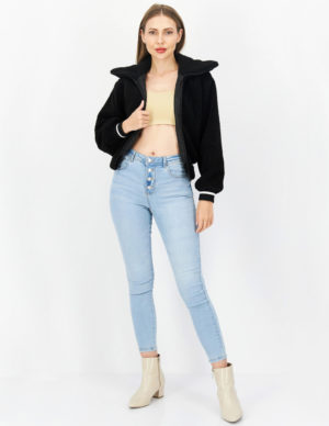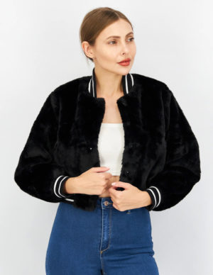 MУкорочений бомбер із м’якого плюшевого матеріалу, спереду застібається на кнопки та має дві прорізні кишені