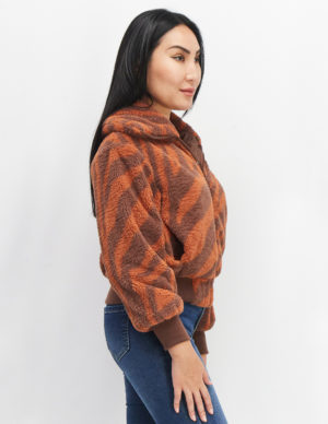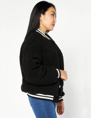 MБомбер із м’якого плюшевого матеріалу, спереду застібається на кнопки та має дві прорізні кишені