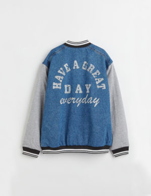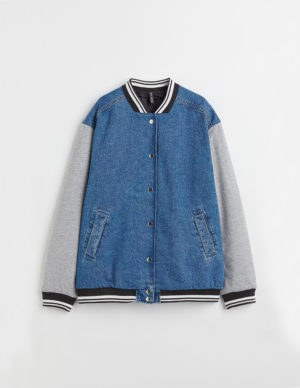 XS SЛегко утеплена бейсбольна куртка з деніму з рукавами з трикотажу. Невеликий ребристий комір, застібки спереду на кнопках та прорізні передні кишені. Вільний крій із заниженими плечима, довгими рукавами та ребристою окантовкою на манжетах та подолу. На підкладці